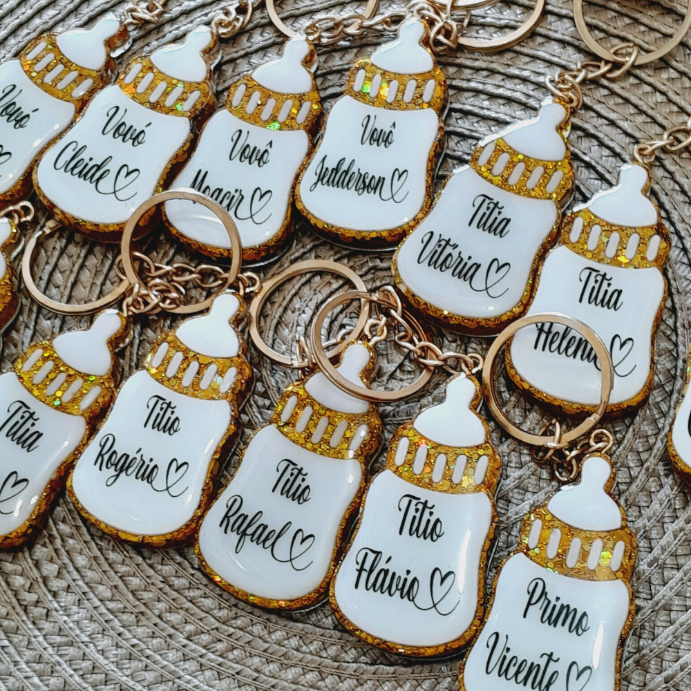 Surpreenda seus convidados com o encantador Chaveiro de Resina em formato de Mamadeira (5,5 x 3 cm), uma lembrancinha personalizada que une delicadeza, utilidade e exclusividade.